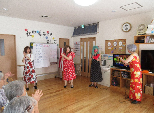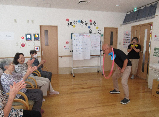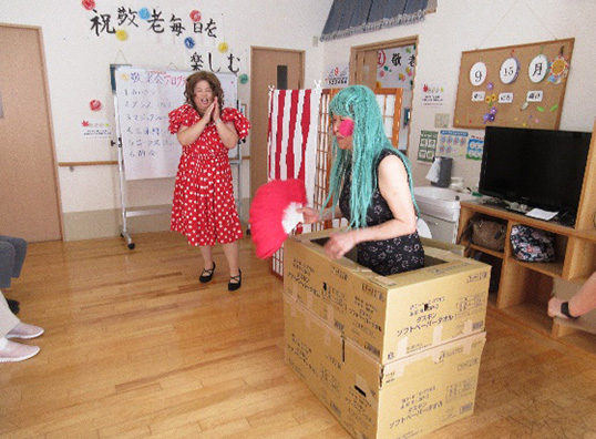 大きな箱に入った職員を利用者さまが次々に剣で刺していきます