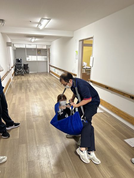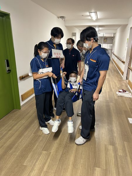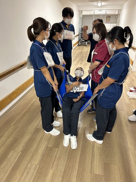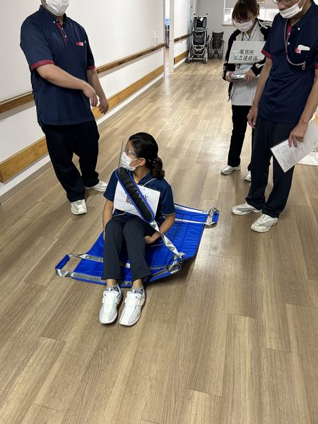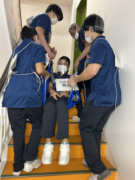 いざという時に冷静に対応できるよう、スタッフ同士で声を掛け合いながら安全に搬送する方法を確認✅