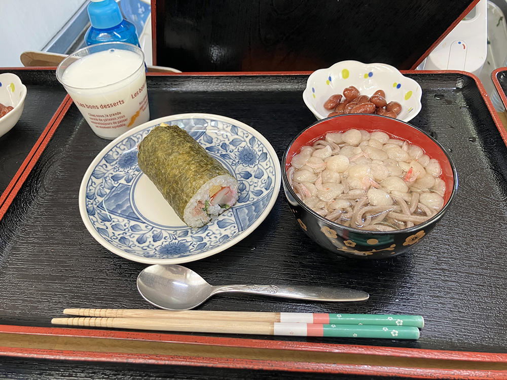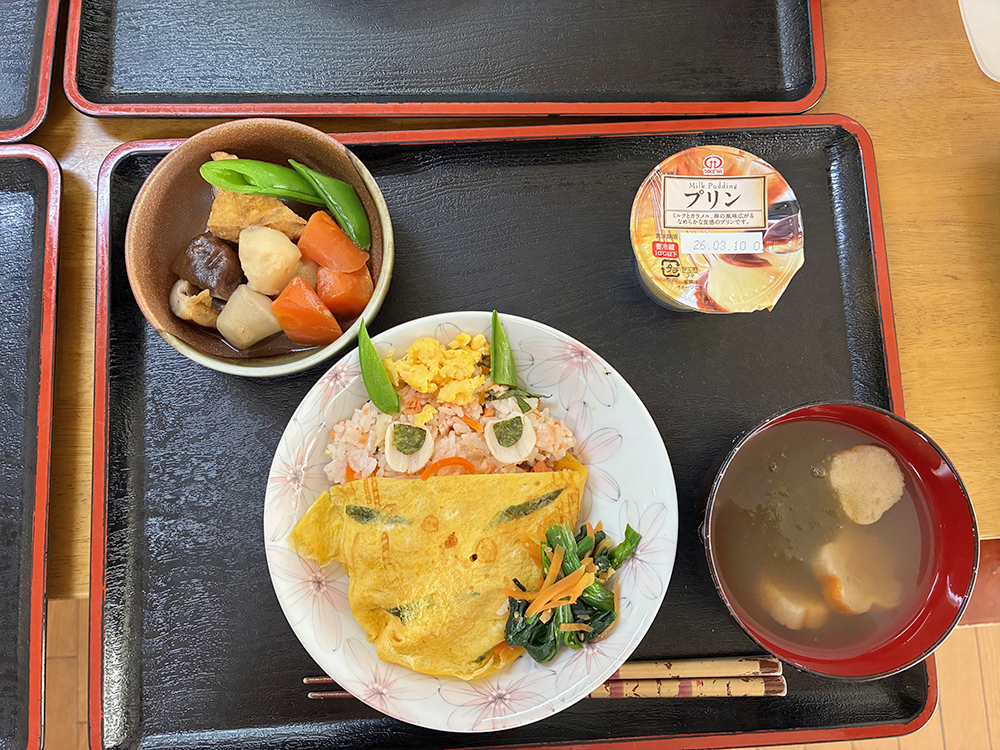 昼食メニューに、1階は鬼をイメージした盛り付けのちらし寿司に煮物とお吸い物